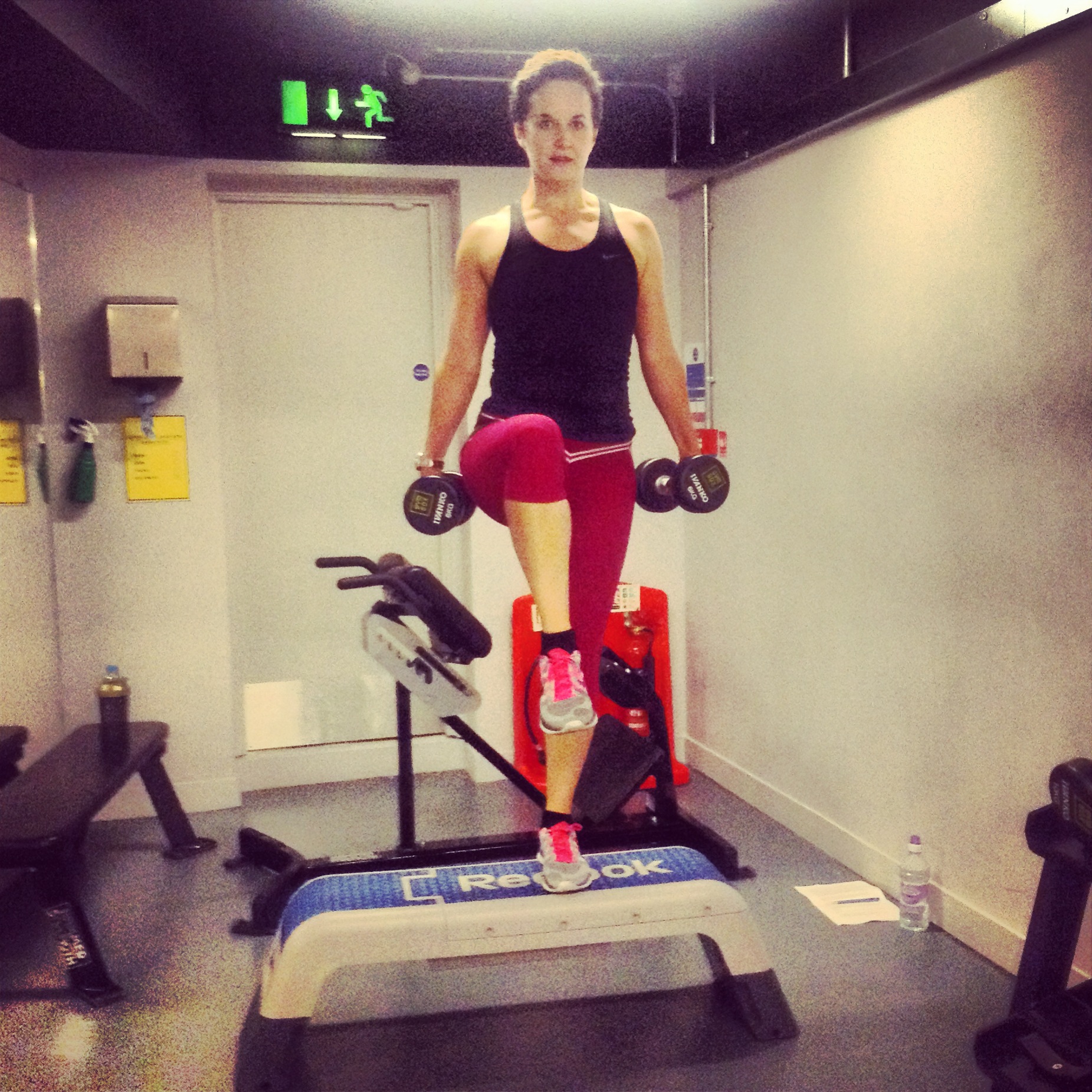 Stepping up on a box or bench, with a barbell over your shoulders, drive the opposite knee upwards from the hip. Perform 10 on each leg. This will strengthen your glutes, stabilise the leg and help generate power when driving the leg forward in running and cycling. If you don’t want to use a barbell, holding a dumbbell in each hand is an easier but still effective option.
